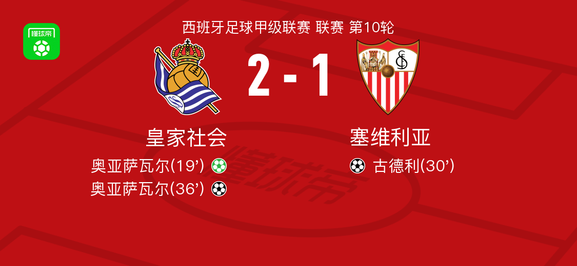 北京时间10月25号西甲第10轮,皇家社会在主场跟塞维利亚干上了。皇家社会的奥亚萨瓦尔直接进了俩球。塞维利亚那边古德利也进了一个。最后比分是皇家社会2-1赢了塞维利亚。>"content="">点这儿看这场比赛的详细数据>>>"content="">点这儿看西甲的完整积分榜>>精彩瞬间第19分钟的时候,皇家社会的奥亚萨瓦尔把点球罚进了。第30分钟,塞维利亚的加布里埃尔-苏亚索给古德利传了个好球,古